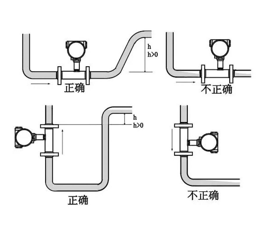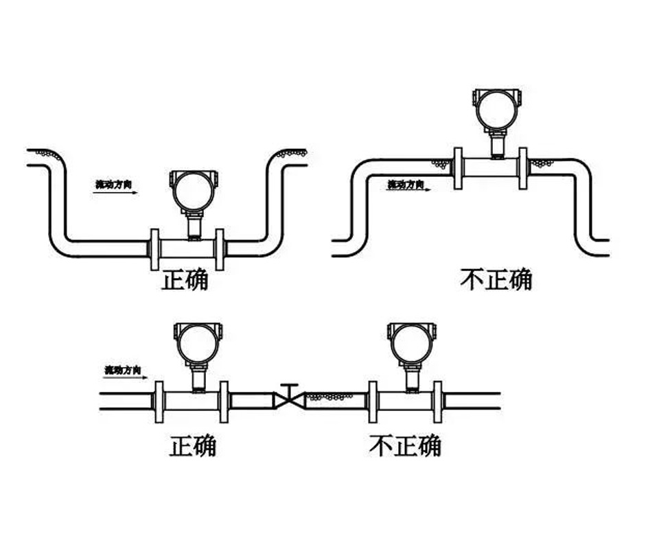 流量計(jì)安裝在彎頭、死角處或者直管前后均應(yīng)保證一定的直管段,其中進(jìn)口端的直管長度不得少于10倍管道直徑,出口端的直管長度不得少于5倍管道直徑。